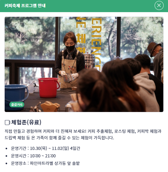 11월 1일 오후 2시, 100명의 시민 바리스타가 직접 내려주는 ‘100가지 커피의 향’을 만나는 시간. 한 잔 한 잔에 정성을 담아내는 특별한 커피 퍼포먼스를 놓치지 마세요.