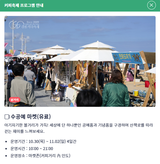 강릉의 로스터리 원두와 디저트를 한자리에서 즐길 수 있는 ‘커피&디저트 마켓’, 그리고 공예품과 소품이 가득한 ‘수공예 마켓’이 열립니다. 운영시간은 매일 오전 10시부터 밤 9시까지입니다.