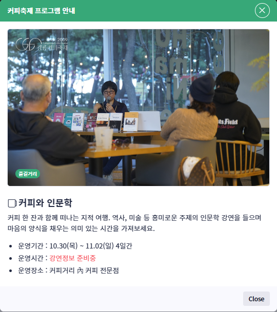 강릉 커피거리 내 카페에서 진행되는 인문학 강연 프로그램.