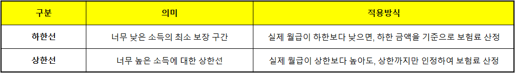 내 실제 월급을 그대로 쓰는 것이 아니라, 국가가 정해둔 최소값(하한)~최대값(상한) 안에서