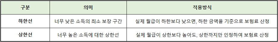 - 상·하한선이 자동 적용되어 급여가 높거나 낮아도 구간 안으로 조정