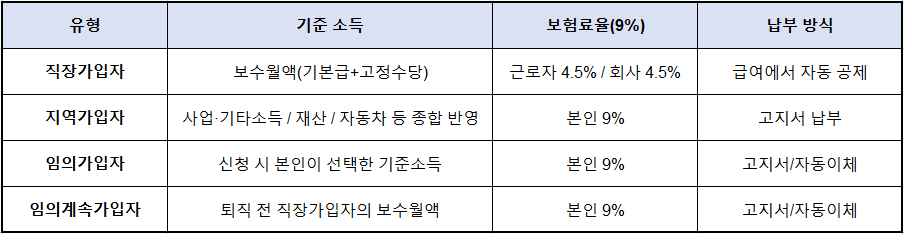 - 🏠 지역가입자: 본인 9% 전액 부담