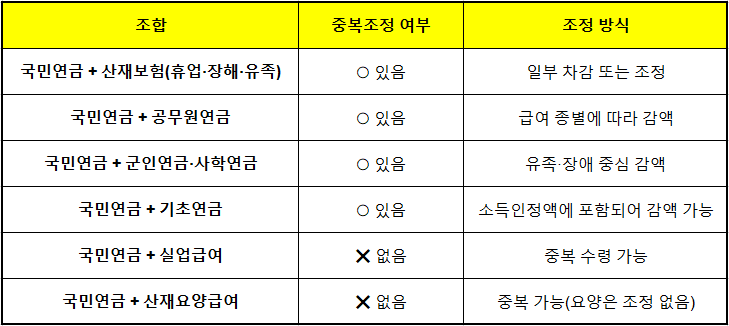 - ❌ 실업급여·요양급여는 중복 조정 없음
