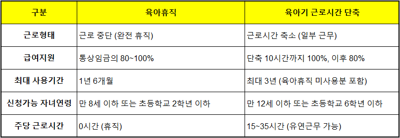 📘 요약: 육아휴직은 완전 휴식, 근로시간 단축은 ‘유연 근무 + 급여 보전’의 형태입니다.