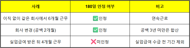 📌 단, 육아휴직은 연속 또는 합산으로 30일 이상이면 가능하며, 12개월 이내 기간 합산이 인정됩니다.