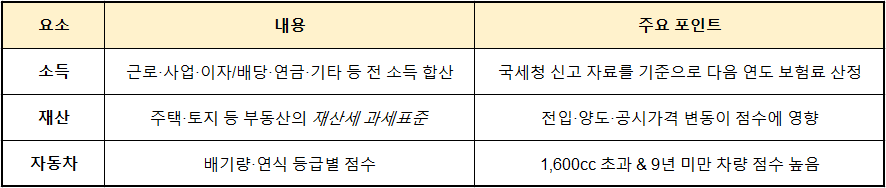 요약: 지역가입자 건강보험료는 소득·재산·자동차 3요소를 점수화해 산정합니다.