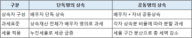 부동산을 단독명의로 배우자나 자녀 한 명에게 몰아주면, 상속세 부담이 집중되어 세율 구간이 급격히 올라갑니다. 반면, 공동명의로 분할 상속하면 과세표준이 분산되어 각자 부담하는 세금이 줄어드는 효과가 있습니다.