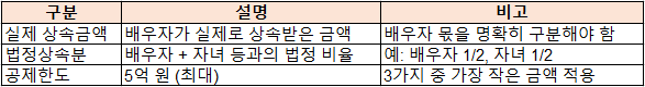 즉, 배우자가 실제로 2억 원만 상속받는다면, 법적으로 5억 원까지 가능하더라도 공제금액은 2억 원으로 제한됩니다.