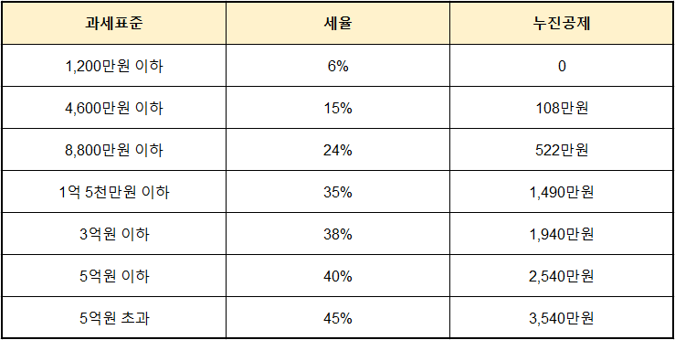 예를 들어, 과세표준이 5,000만원이라고 가정할 때 전체 금액에 24%를 곱해버리면 실제보다 과도한 세금이 부과됩니다.