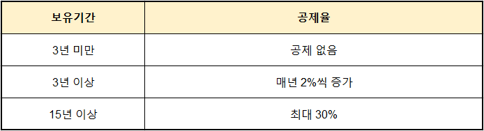 일반 부동산은 거주 요건이 필요 없으므로 단순히 오래 보유하는 것만으로 공제가 증가합니다.