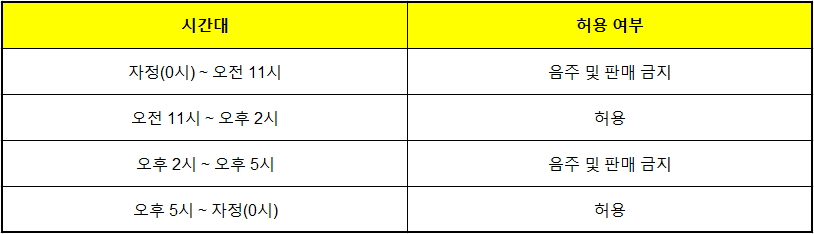 - 오전 11시 이전이나 오후 2시~5시 사이에 편의점·마트에서 술 구매 → 자동 거절 또는 단속 대상