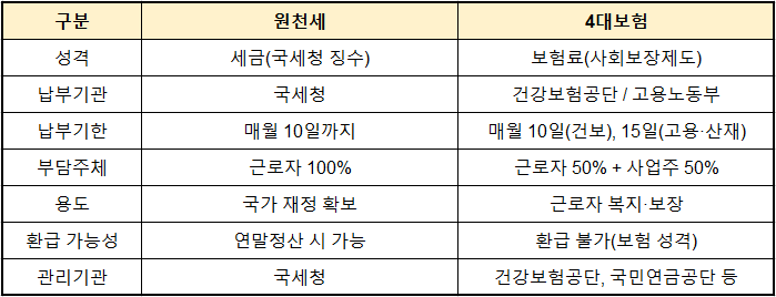 3️⃣ 원천세 vs 4대보험 핵심 차이점