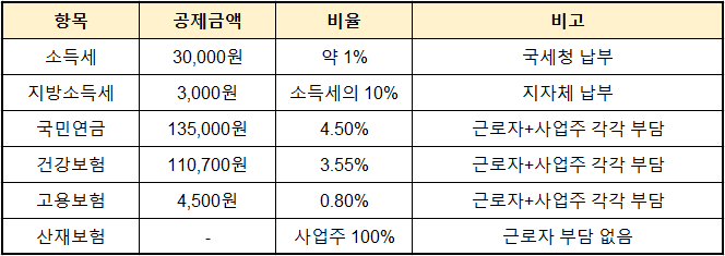 예를 들어, 직원의 월급이 300만 원인 경우 다음과 같이 공제가 이루어집니다 👇