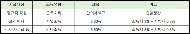 직원과 프리랜서에게 지급하는 금액의 세율 적용을 잘못하면 과다납부나 추징이 발생할 수 있습니다.