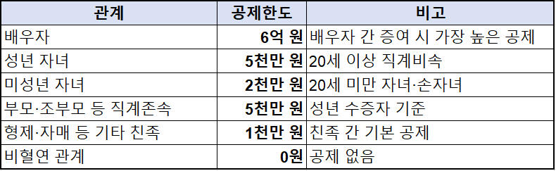 관계별로 공제 한도는 크게 다릅니다. 아래 표는 2025년 기준 가족별 증여세 공제금액을 정리한 내용입니다.