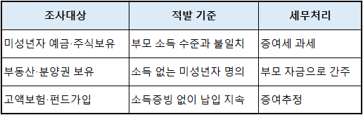 국세청은 미성년자가 예금·부동산·주식 등 자산을 보유하면 ‘자금출처조사’를 통해 해당 자금이 어디서 왔는지 확인합니다.