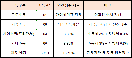 원천세 - 원천세가 적용되는 소득의 종류 (급여·이자·배당·프리랜서)