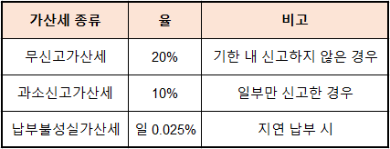 원천세는 기한을 하루라도 넘기면 가산세가 부과됩니다. 다음 표는 주요 가산세 유형입니다.