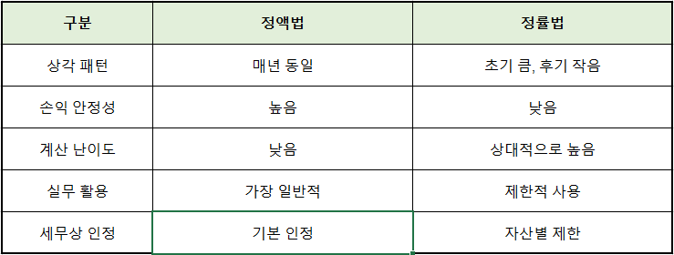 - ✔ 정액법·정률법 모두 허용