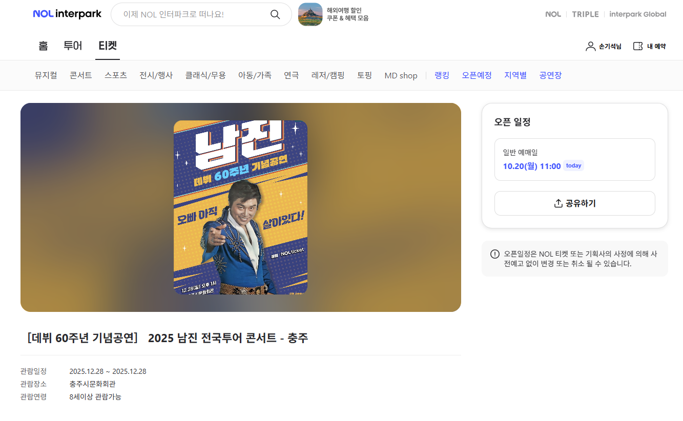 2025.10.20 - [분류 전체보기] - 🎤 2025 남진 데뷔 60주년 기념 콘서트 – 부천 공연 티켓오픈 안내