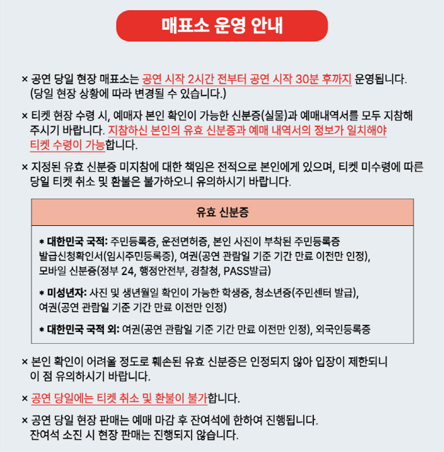 - 불법 거래 적발 시 사전 통보 없이 예매 취소 및 법적 조치가 있을 수 있습니다.