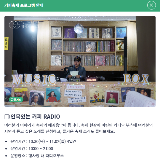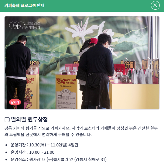 매년 약 30만 명이 찾는 이 축제는 단순한 커피 행사를 넘어, ‘커피 도시 강릉’의 브랜드를 전 세계에 알리고 있습니다.