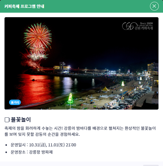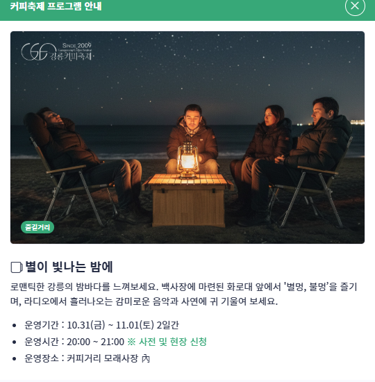 10월 31일과 11월 1일 밤 8시부터 펼쳐지는 ‘별이 빛나는 밤에’는 안목해변을 배경으로 커피와 별빛, 음악이 함께하는 낭만의 시간입니다. 이후 불꽃놀이가 이어져 가을 밤하늘을 화려하게 물들입니다.