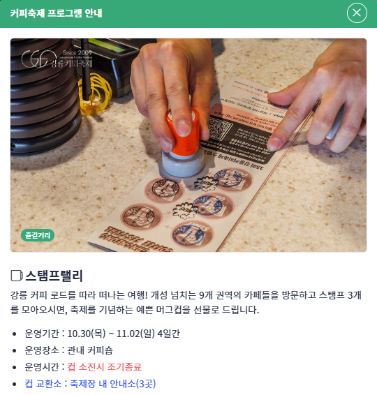 축제 기간 중 강릉 커피거리 내 카페에서 음료를 구매하면 스탬프를 받을 수 있습니다. 서로 다른 권역의 3곳에서 스탬프를 모으면 한정판 머그컵 증정!