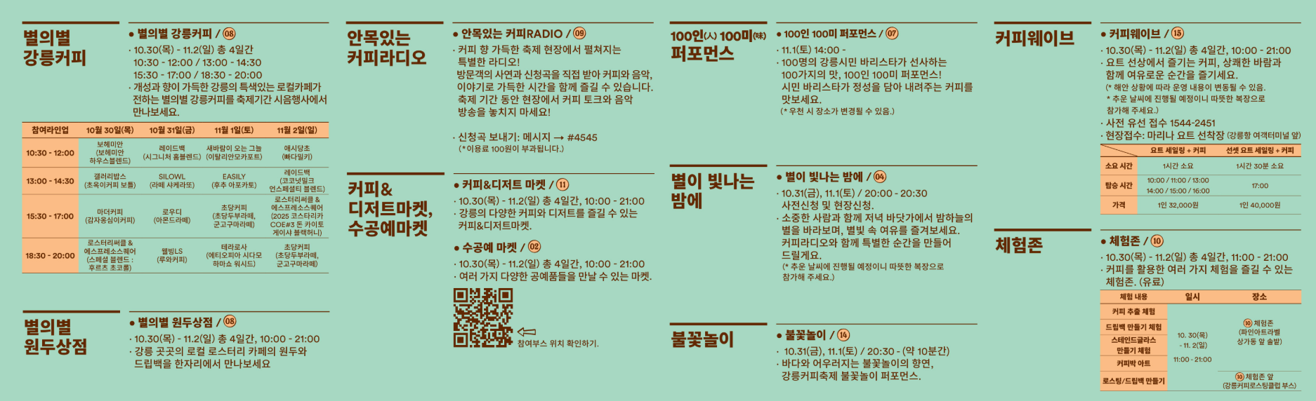 보헤미안, 테라로사, 초당커피, 마더커피 등 강릉을 대표하는 카페들이 참여하며, 오전부터 밤까지 네 타임(10:30 / 13:00 / 15:30 / 18:30)으로 운영됩니다.