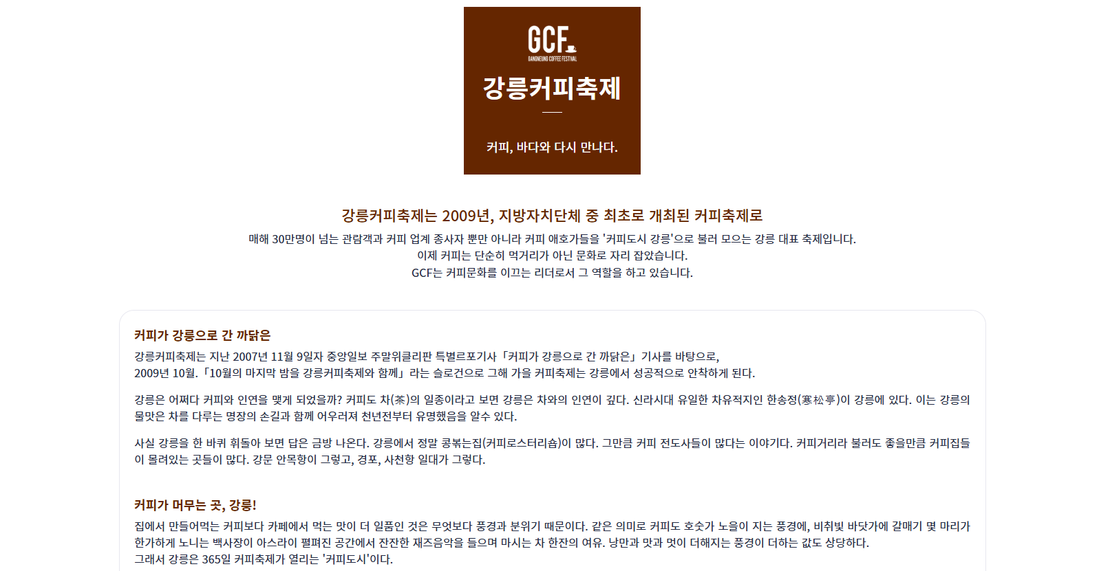 2009년 전국 최초의 지방자치단체 주관 커피축제로 시작한 강릉커피축제(GCF)는 이제 명실상부한 대한민국 대표 커피축제로 자리 잡았습니다.