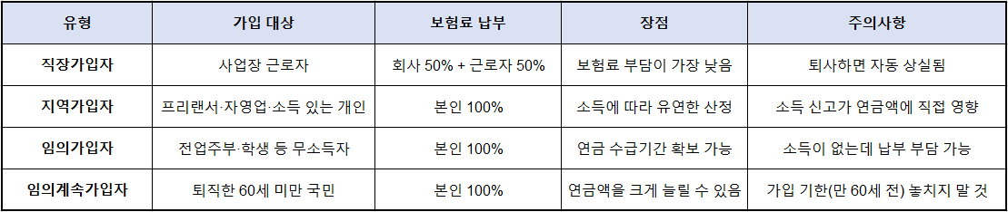 2️⃣ 국민연금 4가지 가입 유형 한눈에 보기