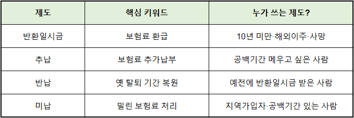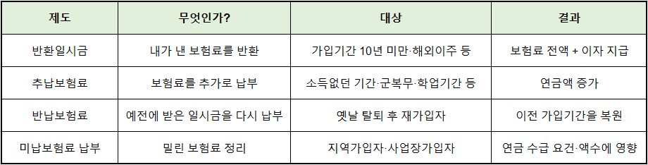 국민연금은 노후연금이지만, 중간에 퇴사·해외이주·보험료 공백 등이 생기면 반환일시금, 추납, 반납, 미납 같은 제도가 등장합니다.