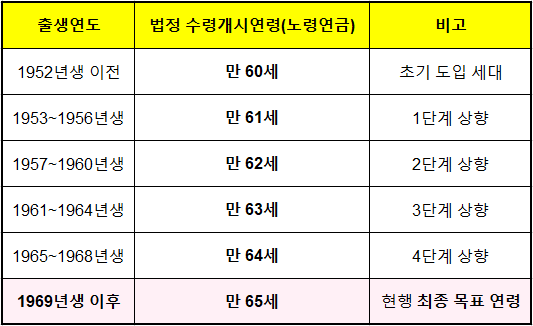 - 📌 출생연도별 수령개시연령 61→65세 단계 상향