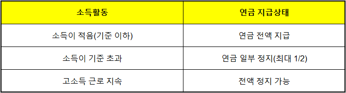 근로소득이 일정 기준을 넘을 경우 연금의 1/2까지 지급 정지될 수 있습니다.