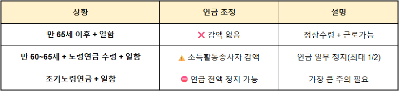 - ⛔ 조기노령연금 + 소득 → 전액 정지