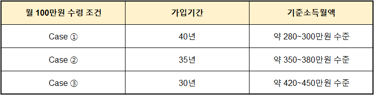 즉, 가입기간이 길거나, 소득이 높거나, 혹은 둘 다 평균 이상이면 월 100만원 달성은 전혀 어렵지 않습니다.