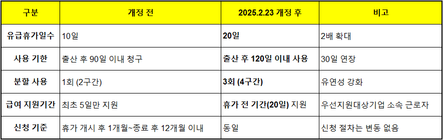 - 시행령 개정(2025.2.23.): 휴가일수, 사용기한, 분할사용, 급여지원기간 개정