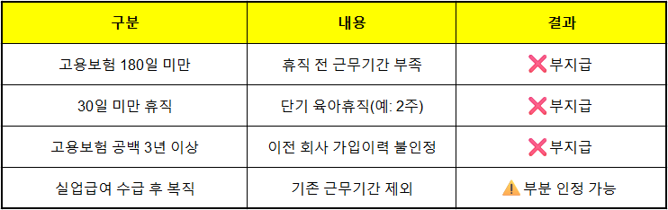 📌 단, 육아휴직은 연속 또는 합산으로 30일 이상이면 가능하며, 12개월 이내 기간 합산이 인정됩니다.