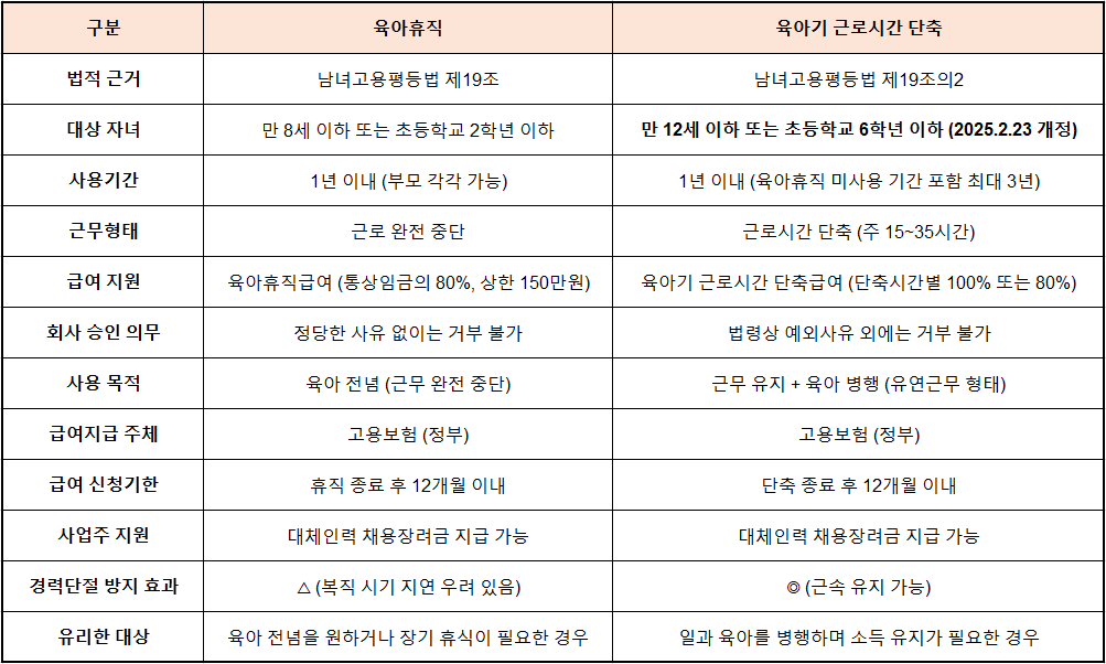 근로 - 육아휴직 vs 육아기 근로시간 단축 차이 비교표 (2025년 최신판)