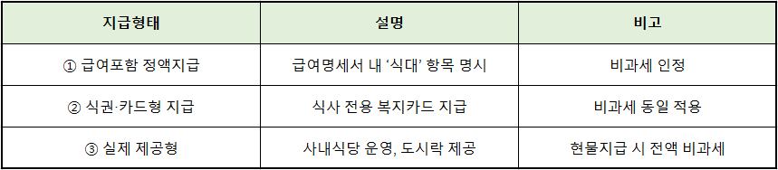 특히 사내식당 운영 시, 현물제공은 금액제한 없이 비과세이므로 규모 있는 기업에서는 복지효율이 매우 높습니다.