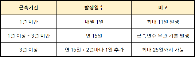 연차휴가는 근속기간과 근무일수에 따라 발생합니다. 법정 기준은 다음과 같습니다 👇
