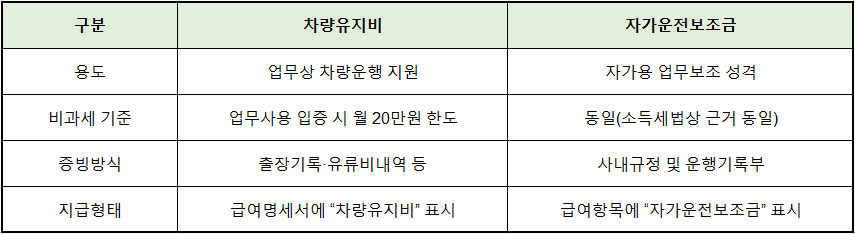 차량유지비와 자가운전보조금은 개념상 거의 동일하지만, 실무에서는 용어와 지급방식이 다르게 사용됩니다 👇