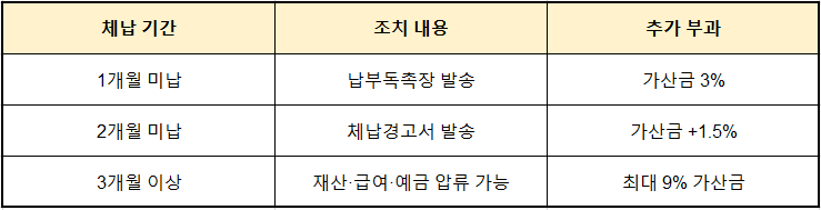 ※ 가산금은 최초 체납액의 3% + 매월 1.5%씩 부과, 최대 9%까지 누적됩니다.