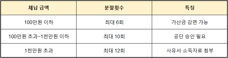 - 분할납부: 6~12회, 납부이행 시 가산금 일부 감면