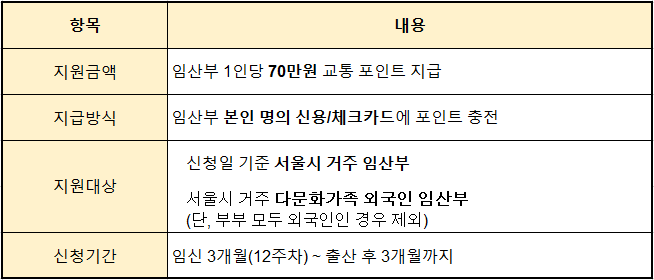 서울시 임산부 교통비 지원사업은 교통약자인 임산부의 이동 편의를 높이고, 출산가정의 경제적 부담을 줄여 안정적인 출산환경을 만드는 사업입니다. 임산부 본인 명의 신용(체크)카드에 70만원의 교통 포인트가 지급됩니다.