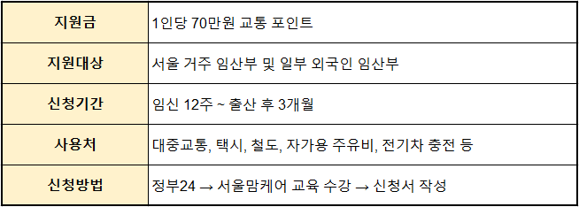 서울시가 임산부의 이동 부담을 줄이고 건강한 출산을 지원하기 위해 임산부 교통비 70만원을 지원합니다. 교통약자인 임산부의 안전하고 편리한 이동을 돕는 이번 사업, 신청자격과 방법을 자세히 정리했습니다.