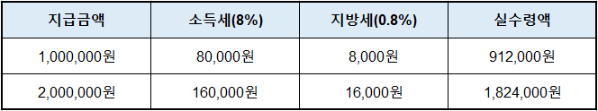 👉 국세청 홈택스 > 원천세 간이세액표 메뉴에서 확인 가능합니다. - Q3. 기타소득은 무조건 8.8%인가요?