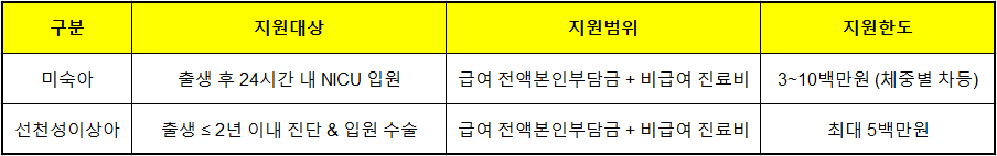※ 선천성이상아는 수술 관련 치료비만 지원(입원 전체 X)
