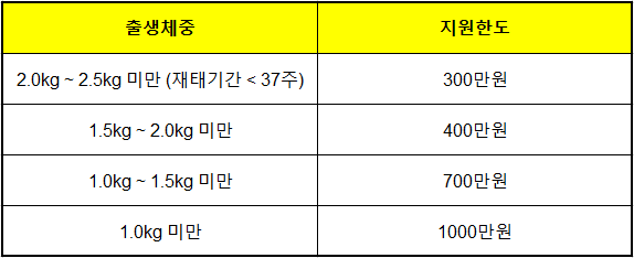- 👶 미숙아: 체중별 300~1000만원 지원