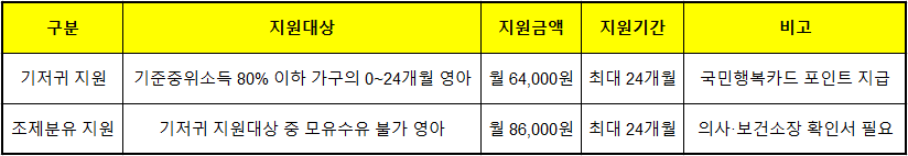 - 🧷 기저귀 월 64,000원 / 조제분유 월 86,000원 지원